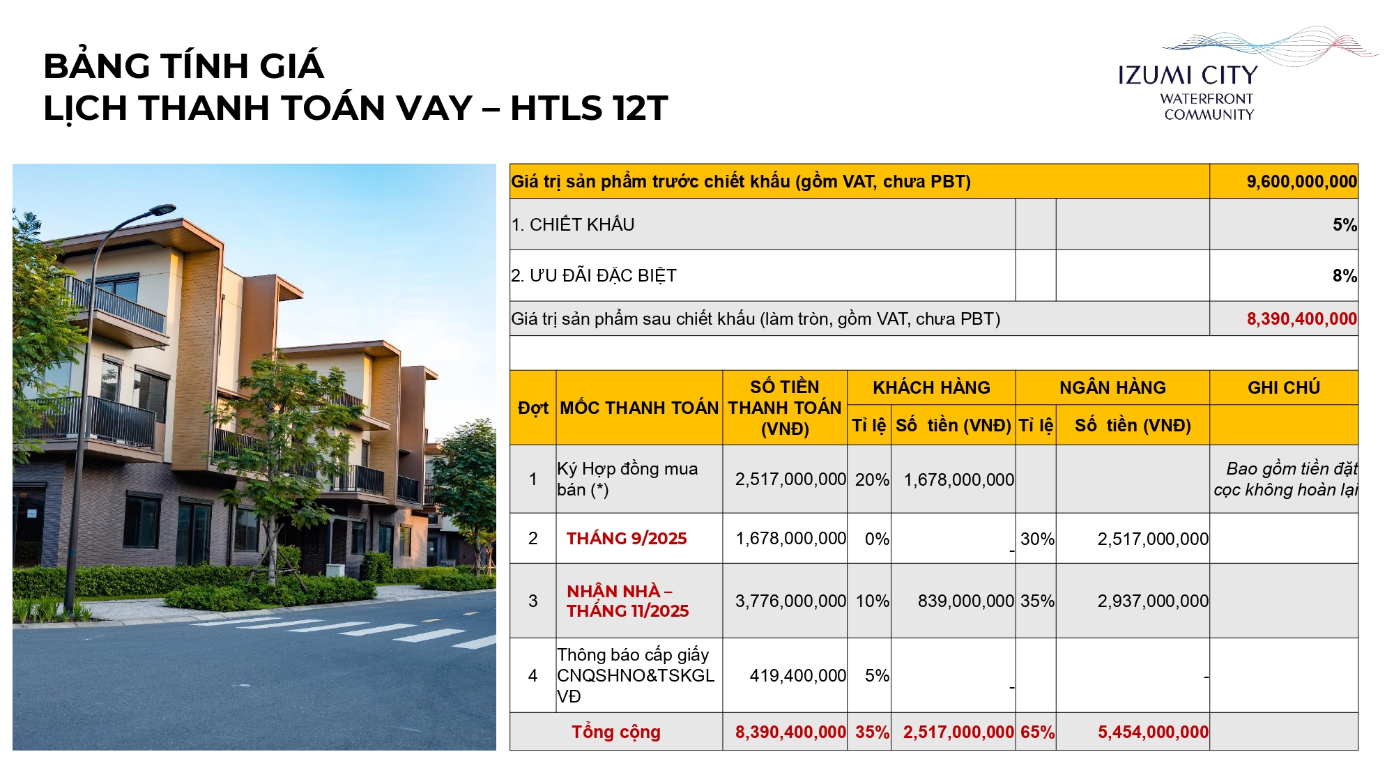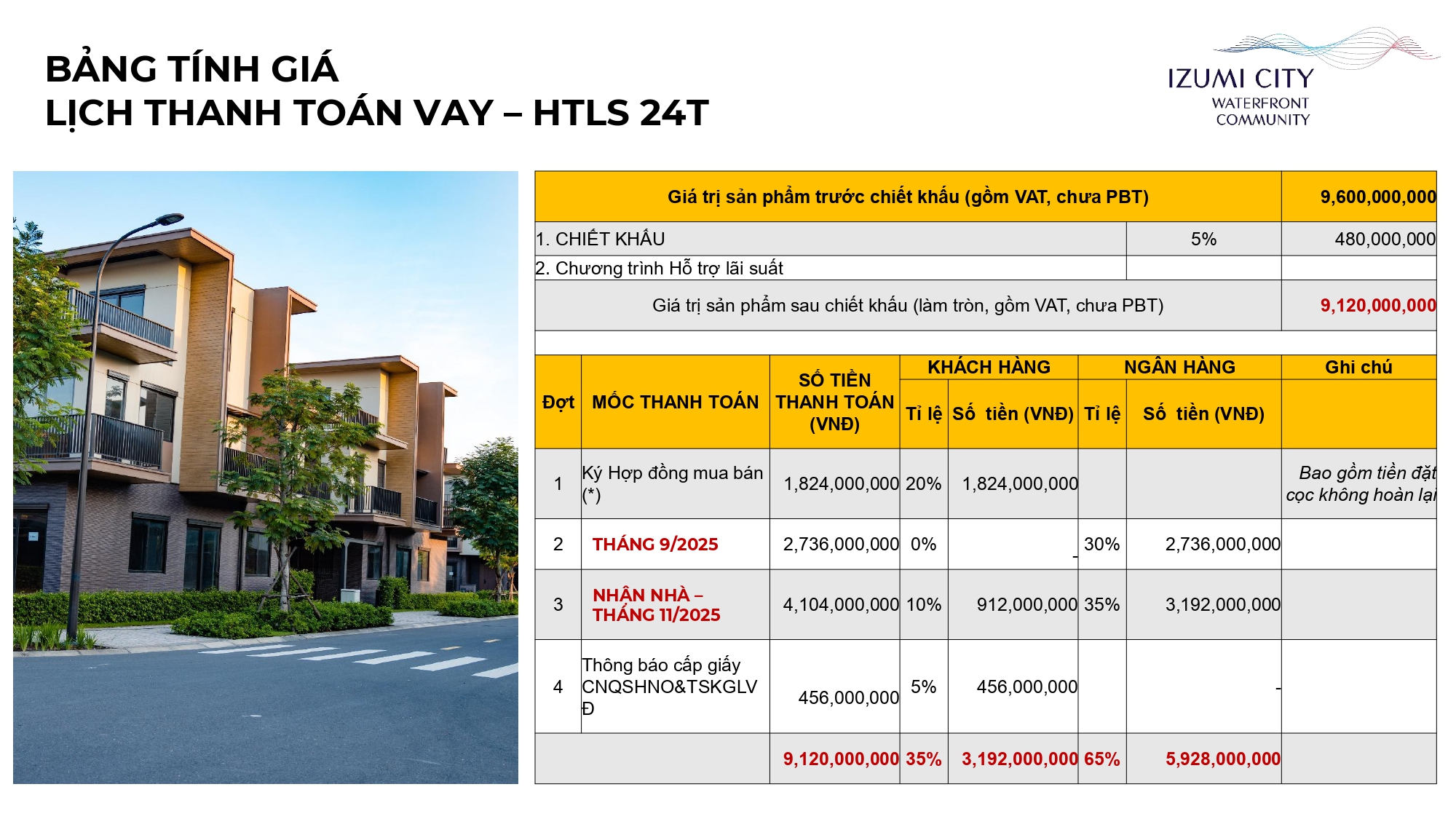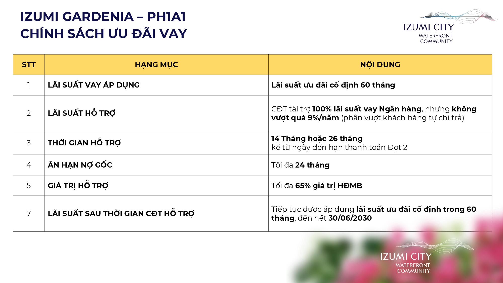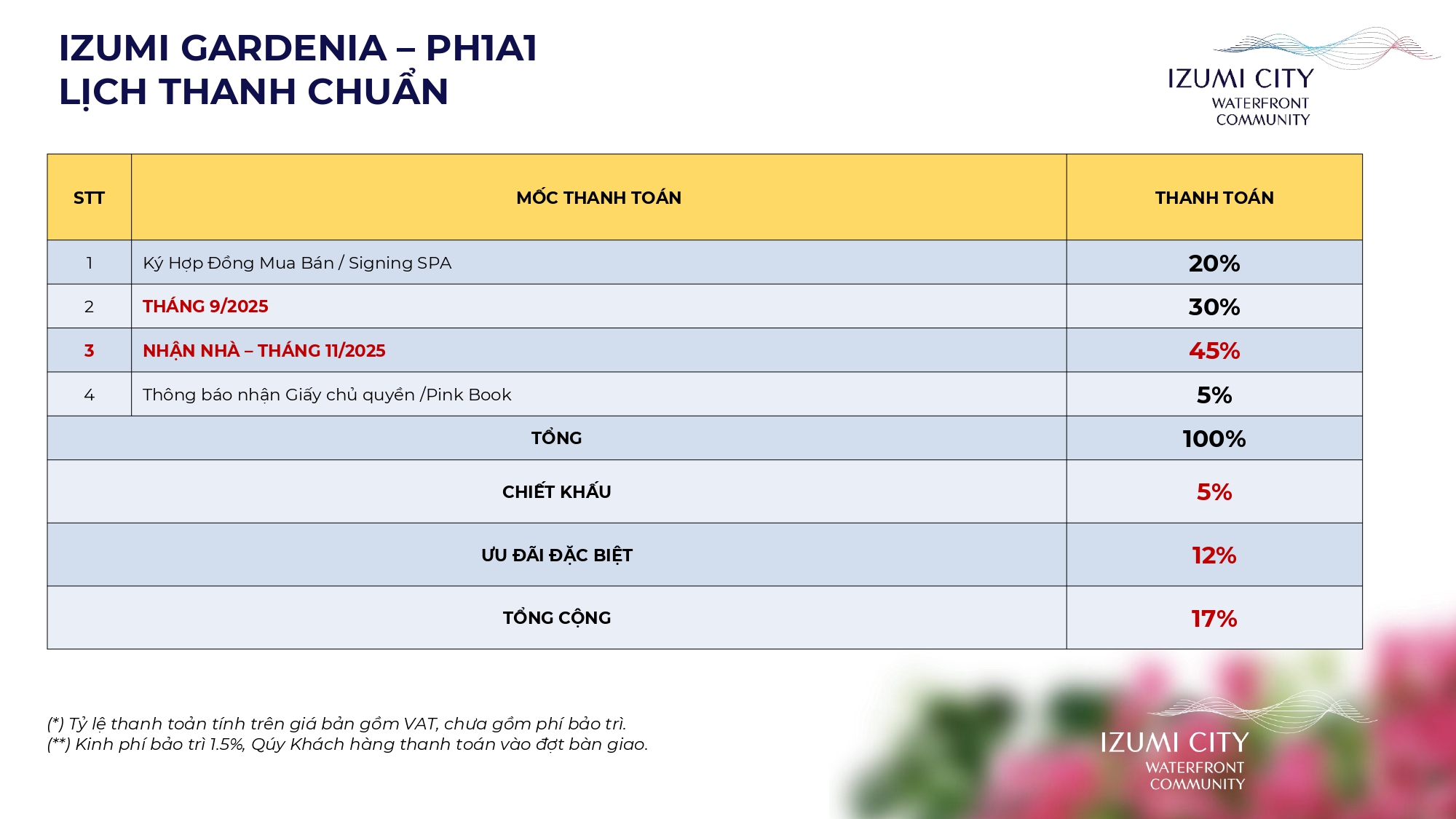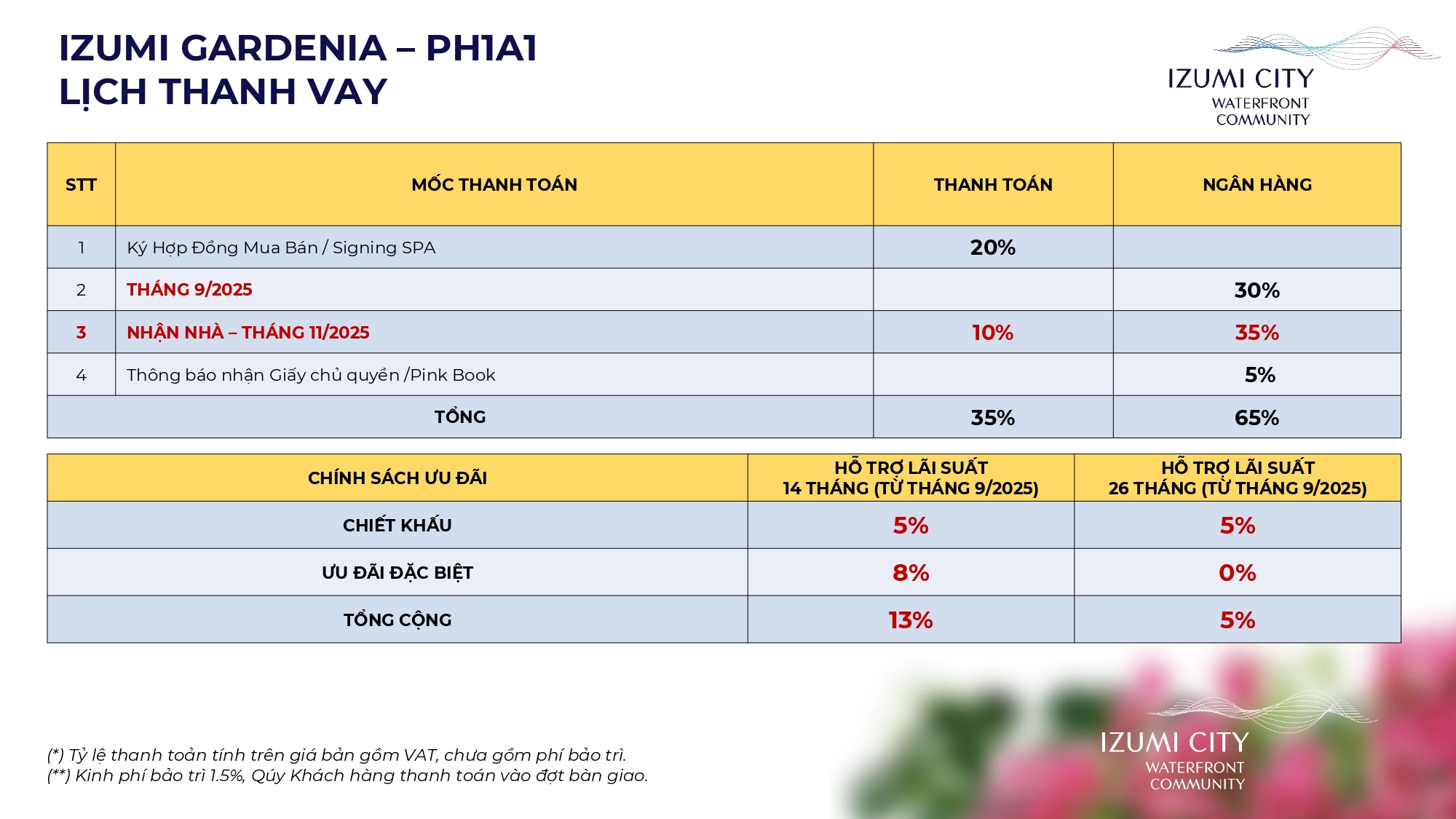 Chính sách và lịch thanh toán vay mua nhà Izumi Gardenia (Giai đoạn 1)