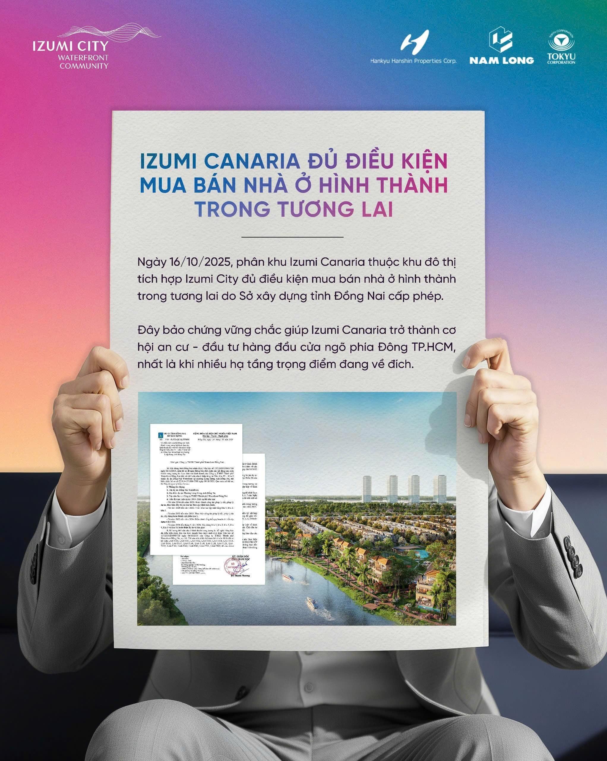 Ngày 16/10/2025, phân khu Izumi Canaria thuộc khu đô thị tích hợp Izumi City đủ điều kiện mua bán nhà ở hình thành trong tương lai do Sở Xây Dựng tỉnh Đồng Nai cấp phép.