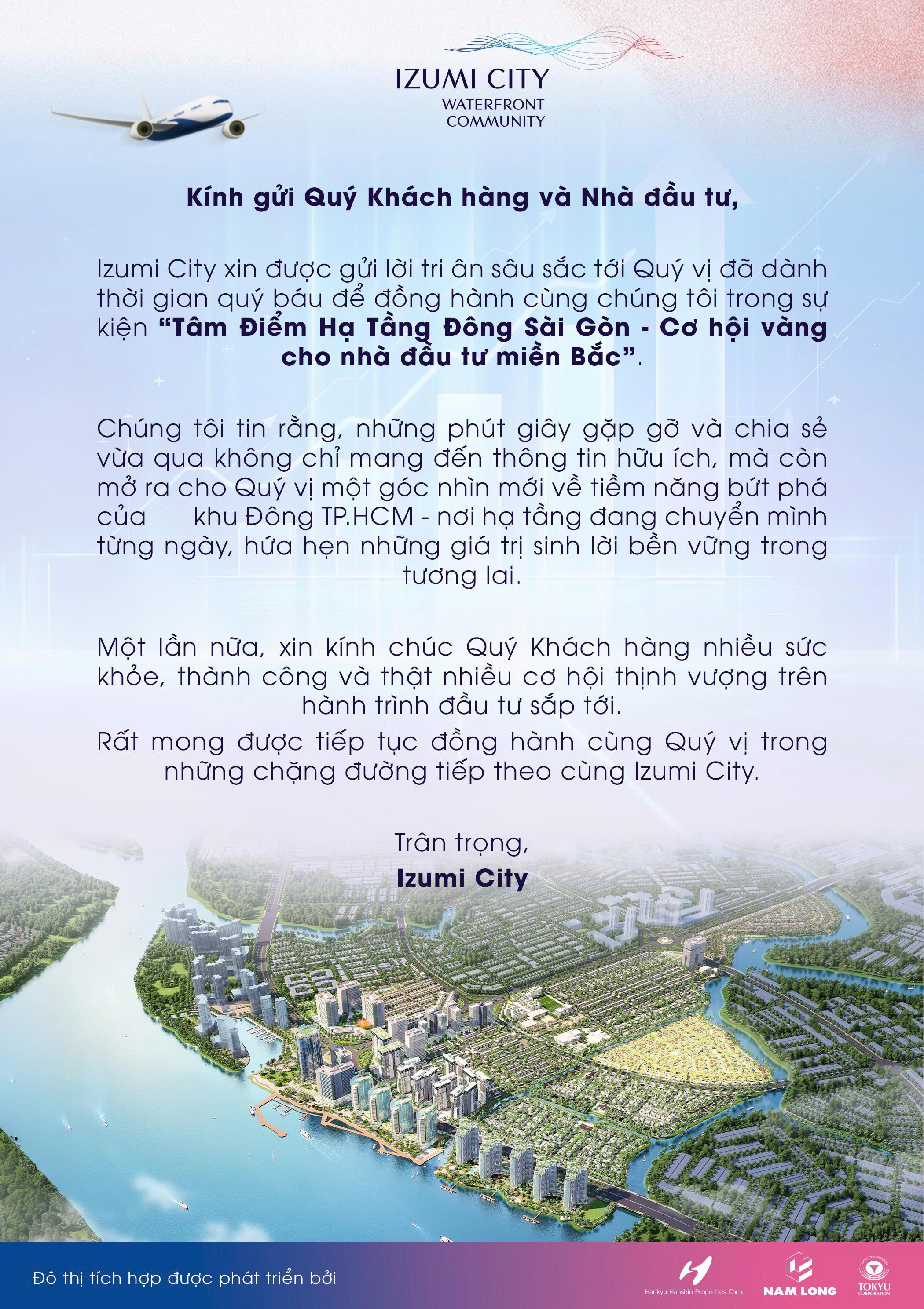 Izumi City trân trọng gửi lời cảm ơn sâu sắc đến Quý Khách hàng & Nhà đầu tư đã dành thời gian tham dự sự kiện “Tâm điểm hạ tầng Đông Sài Gòn – Cơ hội vàng cho nhà đầu tư miền Bắc” vừa qua.
